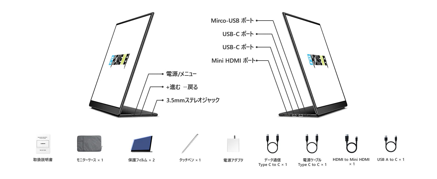 モニターケース、HDMIケーブル、データ通信ケーブル、給電ケーブル、USB A toUSB Cケーブル、電源アダプター、タッチペン、保護フィルムx2