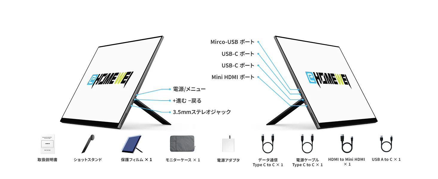 モニターケース、スタンド、HDMIケーブル、データ通信ケーブル、充電ケーブル、USB A toUSB Cケーブル、電源アダプター、保護フィルムx1