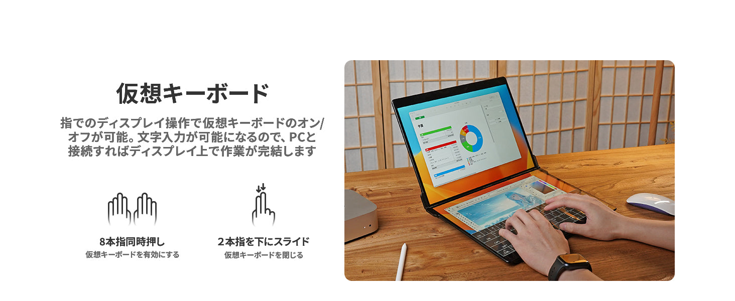 指でのディスプレイ操作で仮想キーボードのオンオフが可能。文字入力が可能になるのでPCと接続すればディスプレイ上で作業が完結します。