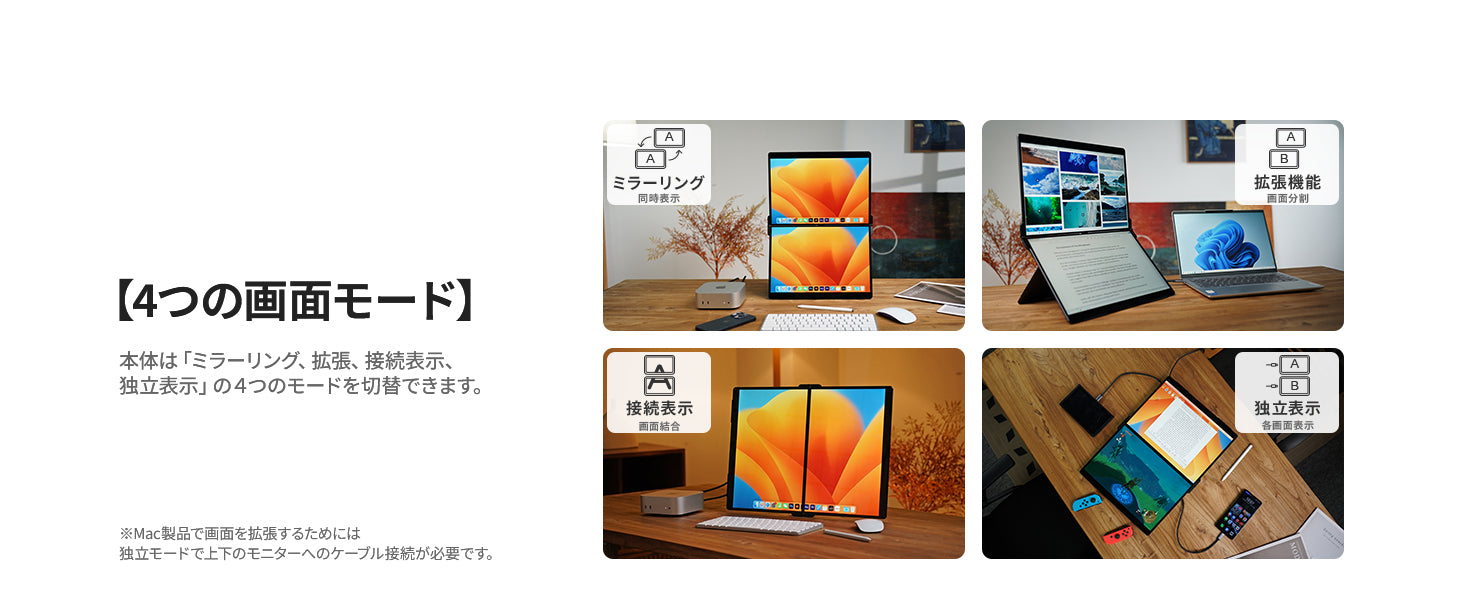 4つの画面モードで用途に応じて自由自在に切り替えることができます。