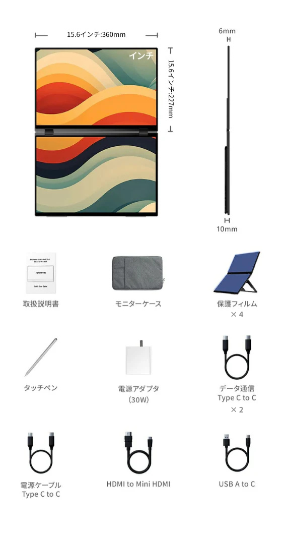 モニターケース、HDMIケーブル、データ通信ケーブル×2、給電ケーブル、USB A to USB Cケーブル、電源アダプター、タッチペン、保護フィルム×4